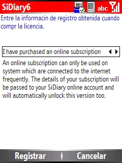 Si has comprado la Versión de Suscripción de SiDiary, puedes registrar el programa para todas las plataformas disponibles (PC, Pocket PC, Windows Smartphone, Android y teléfonos celulares-Java), para usar SiDiary por 12 meses sin las restricciones de la Versión Adware y las ventanas emergentes con anuncios publicitarios.