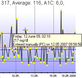 The line and dot graphs provide tooltips for all readings. Just move the mouse over a reading and the tooltip will be displayed so that you can view date, time and the exact value. Additionally, you can click to each reading and SiDiary will open your log book with the appropriate day.