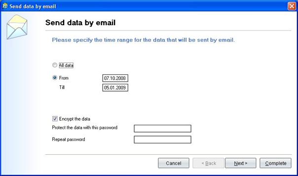 With this program function you are able to send your diabetes data to your doctor or a confidant by Email. Select the required time range, whether the data shall be encrypted and/or protected with a password and insert the details for your Email account. If you use Microsoft Outlook, SiDiary is able to use the already arranged Email-program.