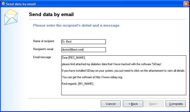 The third option: You have a SiDiary-Online account (http://diabetes.sinovo.net/). Then you do not have to enter your account data and you do not have to use Outlook as your mail program. You can send you mails then with SiDiary-Online.
