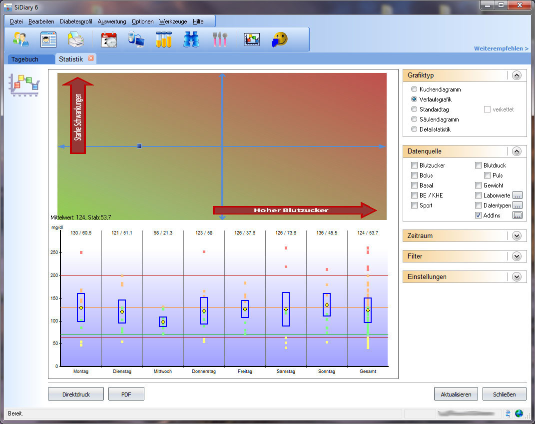 Wenn Sie auf einen Blick sehen wollen wie es derzeit um Ihren Blutzucker bestellt ist dann laden Sie sich doch dieses kostenlose AddIn runter, um die Statistik aufzuwerten. Sie sehen dann auf einen Blick sowohl wie sich Ihr mittlerer BZ und die Standardabweichung zueinander verhält, als auch eine Standardwoche (alle Messwerte des gewählten Zeitraums auf eine Woche projeziert).