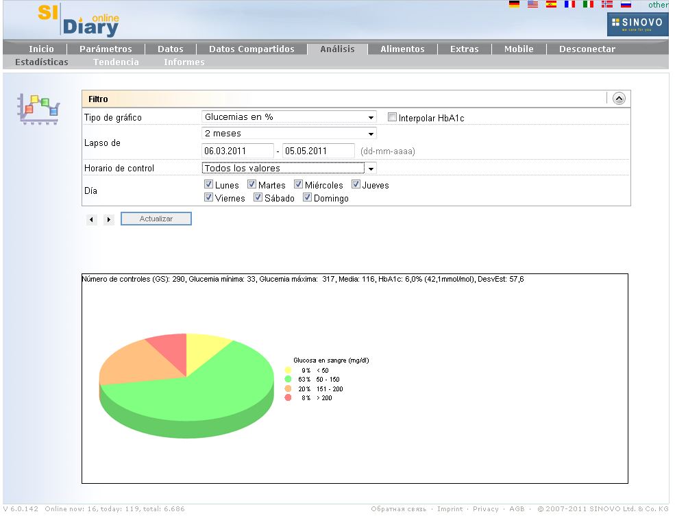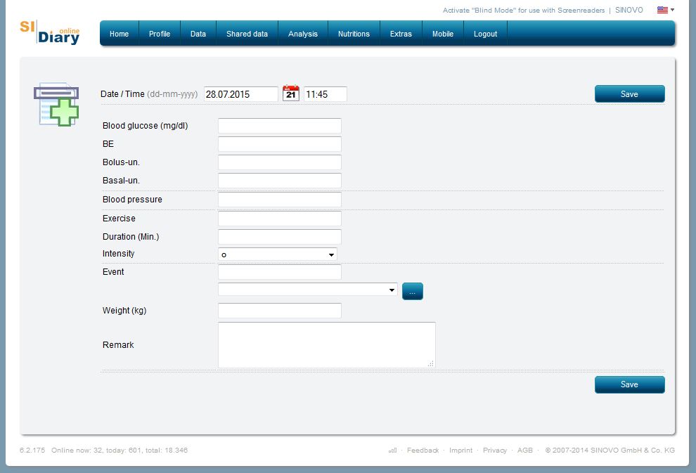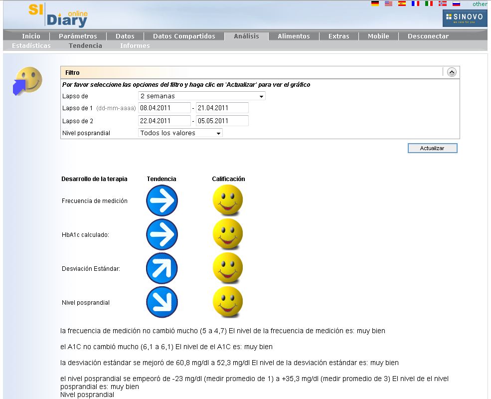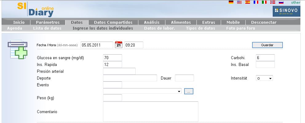 La gestión de tu diabetes se hace más flexible con 'SiDiary Online'. Sólo necesitas un navegador para Internet (por ejemplo, Internet Explorer, Firefox o Safari) para iniciarlo. Con la asistencia de estos navegadores, incluso los usuarios de Linux o Apple pueden beneficiarse fácilmente de SiDiary. 'SiDiary Online' está ahora perfectamente equipado, incluso para los navegadores en los dispositivos móviles (Smartphone, Blackberry, Android o iPhone). El espacio disponible en las pantallas de los dispositivos, es totalmente utilizado. Si lo deseas, puede instalar una cookie que te permite firmarte (log-in) casi automáticamente. Si eliges la plantilla 'Ingresar un dato' como tu pantalla de inicio por defecto, puedes ingresar tus datos desde el inicio de SiDiary Online.'SiDiary Online' ofrece todas las características que conoces de la versión para PC. Puedes crear un perfil de usuario individual, independientemente del tipo de tu diabetes (tipo 1, tipo 2). El seguimiento de los datos es muy fácil. La mayoría de las funciones de análisis que conoces para Windows o para el Smartphone ya están incluidos en 'SiDiary Online'. Tanto la popular función de tendencia, como el valor calculado de A1c, se encuentran también disponibles en 'SiDiary Online'.