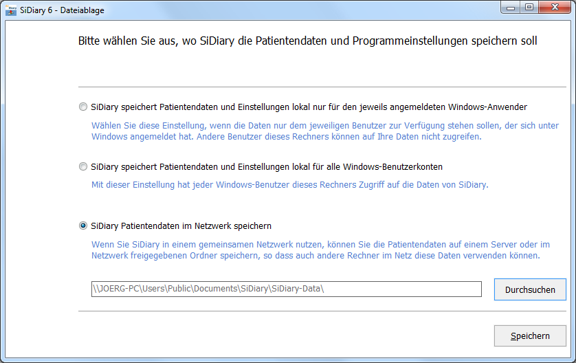 SiDiary Pro-VersionUm SiDiary im Netzwerk zu verwenden, müssen Sie es nur auf jedem Rechner im Netzwerk installieren und mit Ihrer Transaktionsnummer freischalten. Danach können Sie über das Menü 'Werkzeuge ->Dateiablage' ganz einfach einstellen, in welchem freigegebenen Ordner Ihres Netzwerkes die Patientendaten gespeichert werden sollen.